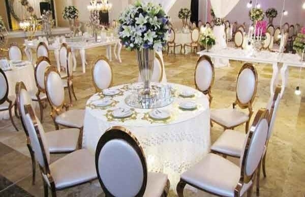 • صندلی‌های مبله استیل: برای تالارهای لوکس و مجلل که به دنبال فضایی شاهانه (Royal) هستند. این صندلی‌ها با پارچه‌های مخمل و چرم درجه یک روکش می‌شوند.