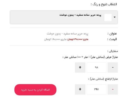 در فروشگاه اینترنتی دیبامک ما میتوانیم با دقت 1 سانتی متر به طور دقیق ابعاد دلخواه خود را سفارش دهیم. به طور مثال در تصویر بالا ابعاد محل نصب 98 سانتی متر عرض در 297 سانتی متر طول بوده است.