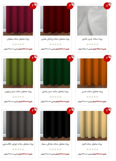 انواع پرده حریر، حریر شاین، کتان، مخمل و هازان در این فروشگاه اینترنتی پیدا می شود همچنین پرده ساده در انواع رنگ ها و چند ده مدل پرده طرح دار ژورنالی در این فروشگاه یافت می شود.