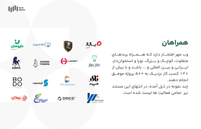ما با افتخار نمونهکارهای متعددی در زمینه طراحی سایت، فروشگاههای آنلاین و سئو داریم که رضایت بالای مشتریان را به همراه داشته است. تجربه موفق همکاری با برندهای معتبر داخلی و بینالمللی، گواه کیفیت خدمات "وب مهر" است.