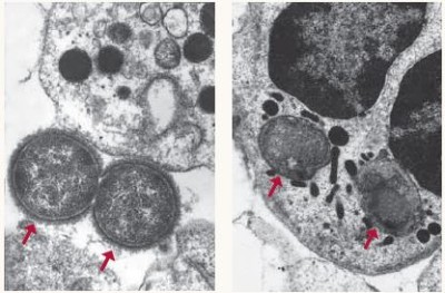 سیستم ایمنی در حال عملیات. یک سیستم ایمنی سالم می تواند مشابه عوامل فوق پاتوژن های مهاجم را شکست دهد. در عکس فوق دو باکتری عامل سوزاک توسط سلولهای فاگوسیت کننده بزرگی به نام نوتروفیل محاصره و کشته شده اند (به فلشهای قرمز دقت کنید).