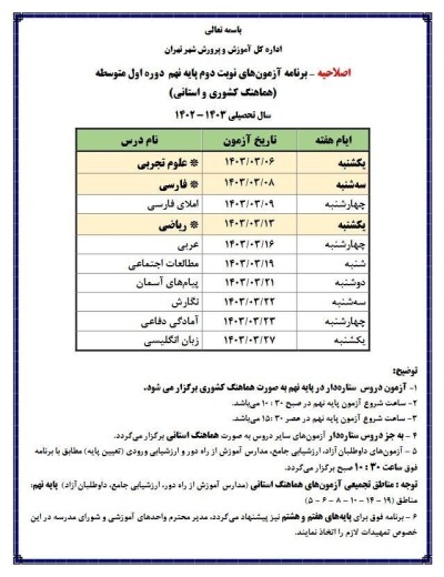 امتحانات سایر دروس بهصورت استانی توسط هر استان برگزار میشود و اکنون شهر تهران برنامه امتحانات دانشآموزان پایه نهم را اعلام کرده است.