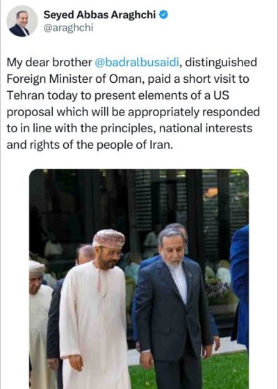 سیدعباس عراقچی، وزیر امور خارجه در حساب ایکس خود نوشت: برادر عزیزم آقای بدر البوسعیدی، وزیر محترم امور خارجه عمان، امروز در سفر کوتاهی به تهران عناصر پیشنهادی آمریکا را ارائه داد که بر اساس اصول، منافع ملی و حقوق مردم ایران به آن پاسخ مقتضی داده خواهد شد.