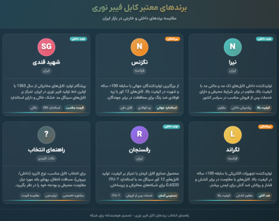 در بازار ایران، برندهای مختلفی از کابل های فیبر نوری موجود هستند که هر کدام ویژگی های مخصوص به خود را دارند. آشنایی با این برندها می تواند به شما در انتخاب بهترین کابل فیبر نوری کمک کند.